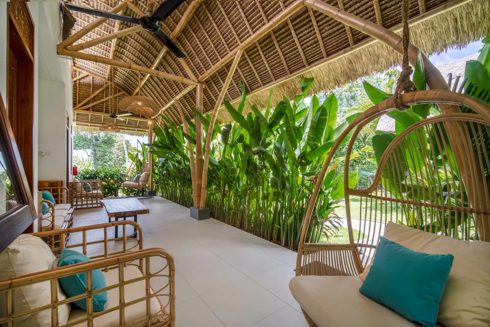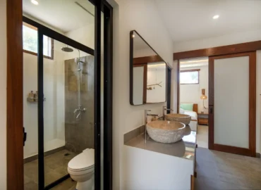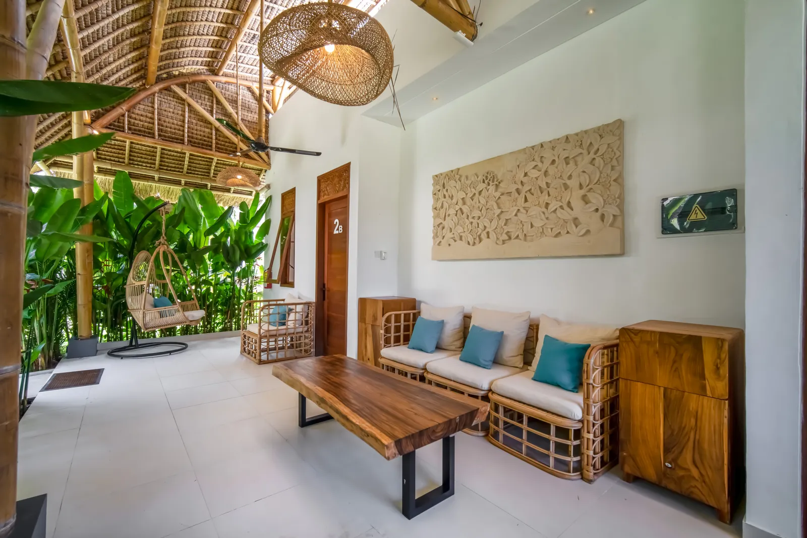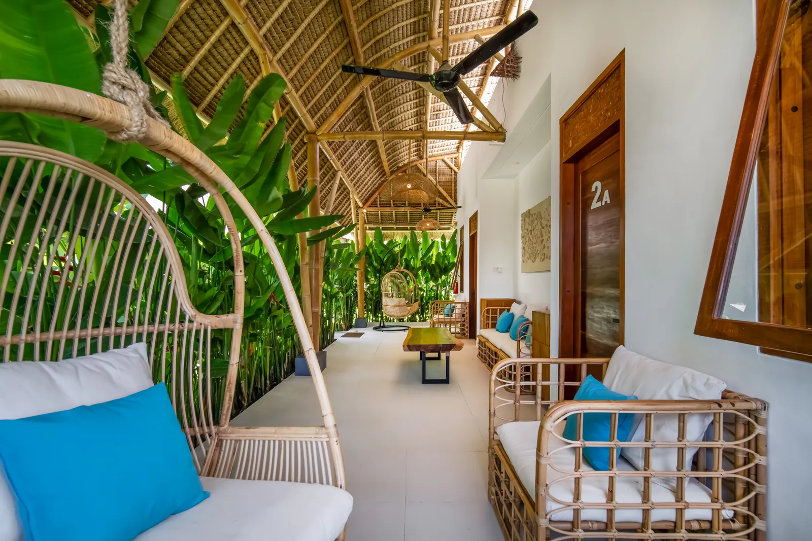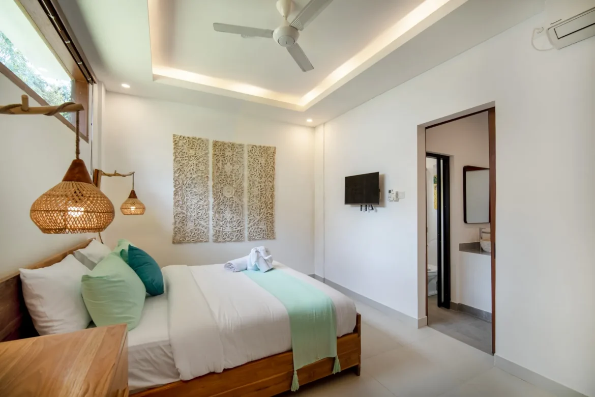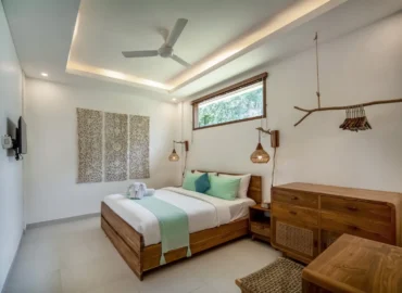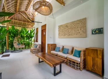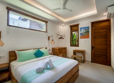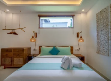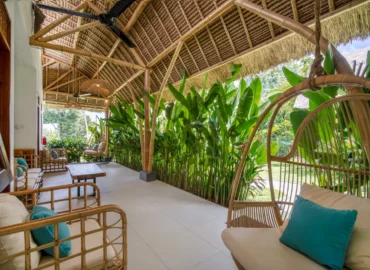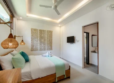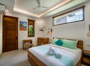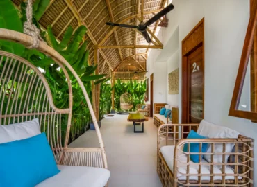 The 2-bedroom boutique villas feature two connected bedrooms, each with a king-size bed, making them an ideal choice for families with children or small groups. The space includes a generous patio with a sitting area and fan, offering a comfortable indoor–outdoor living experience.